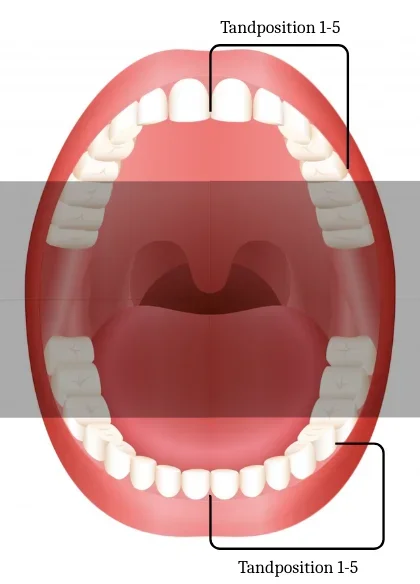 Vad tandposition 1–5 betyder är de första fem tänderna i varje käkhalva, det är alltså framtänder, hörntand och de två första kindtänderna
